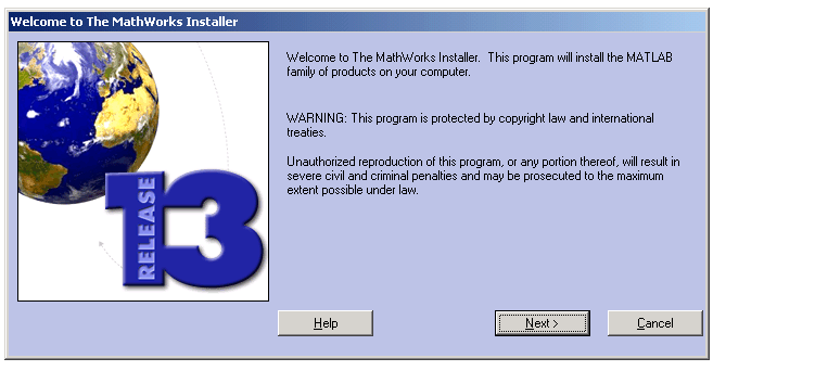 Insert the MathWorks product CD into the CD-ROM drive or double-click the installer file you downloaded from the MathWorks Web site. The MathWorks installer starts automatically, displaying the Welcome to The MathWorks Installer dialog box.