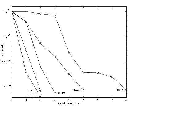 The next graph shows the progress of bicg using six different incomplete LU factors as preconditioners. Each line in the graph is labeled with the drop tolerance of the preconditioner used in bicg.