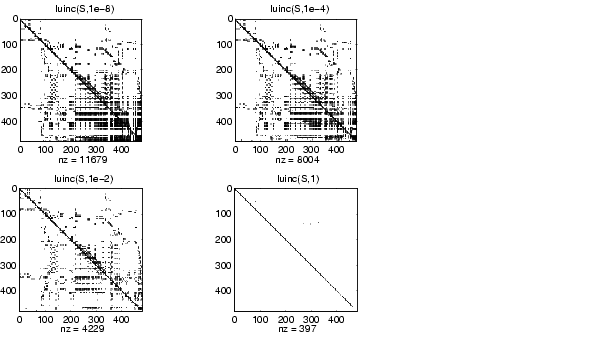 These incomplete factorizations may be useful as preconditioners for solving large sparse systems of linear equations. The lower triangular factors all have 1s along the main diagonal but a single 0 on the diagonal of the upper triangular factor makes it singular. The incomplete factorization with a drop tolerance prints a warning message if the upper triangular factor has zeros on the diagonal. Similarly, using the udiag option to replace a zero diagonal only gets rid of the symptoms of the problem but does not solve it. The preconditioner may not be singular, but it probably is not useful and a warning message is printed.