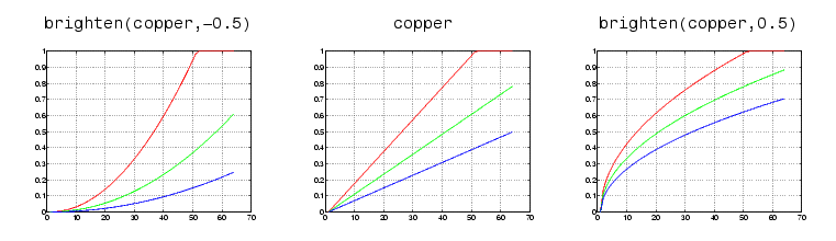 Because colormaps are matrices, you can manipulate them like other arrays. The brighten function takes advantage of this fact to increase or decrease the intensity of the colors. Plotting the values of the R, G, and B components of a colormap using rgbplot illustrates the effects of brighten.