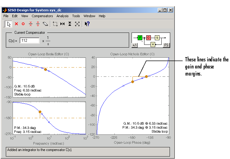 Adding an integrator changes the gain margin from infinity to 10.5 dB. Since the gain and phase margins are now both finite, the Nichols plot displays a vertical line for the gain margin and a horizontal line for the phase margin.