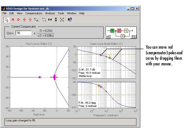 Now try moving the lead network pole to the right. Notice how the gain margin increases as you do this. You can also adjust the gain to increase the gain margin; grab the Bode magnitude curve and drag it downward with your mouse to reduce the gain and increase the gain margin.