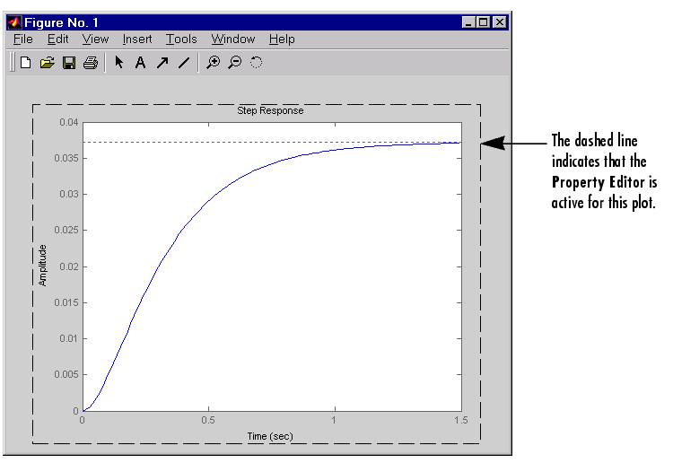 This creates a step plot. Select Properties from the right-click window. Note that when you open the Property Editor, a black dashed box appears around the step response, as this figure shows