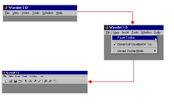 At the top of most windows you find the same kind of structure. The menu bar of each figure in the Wavelet Toolbox is very similar to the menu bar of the default MATLAB figures. You can use many of the tools that are offered in the menus and associated toolbar of the standard MATLAB figures.