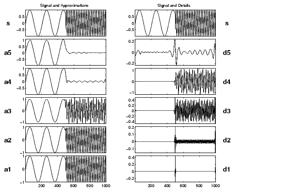 D3 and D4 contain the medium sine as in the previous analysis. The slow sine appears clearly alone in A5. It is more regular than in the s1 analysis, since db5 is more regular than db3. If the same signal had been analyzed by the Fourier transform, we would not have been able to detect the instant corresponding to the signal's frequency change, whereas it is clearly observable here.