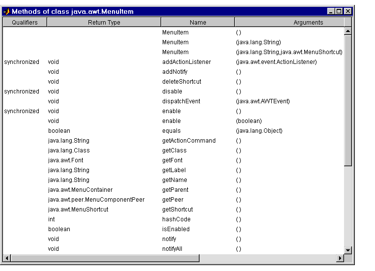 The following command lists information on all methods in the java.awt.MenuItem class.