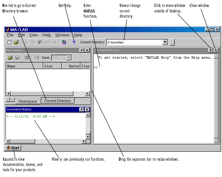 When you start MATLAB, the MATLAB desktop appears, containing tools (graphical user interfaces) for managing files, variables, and applications associated with MATLAB.