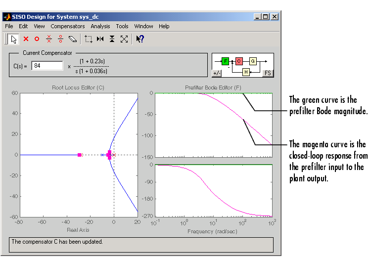 If you haven't imported a prefilter, the default is a unity gain. You can add poles and zeros and adjust the gain using the same methods as you did when designing the compensator (C), including the following: