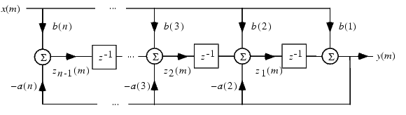 filter is implemented as the transposed direct-form II structure shown below, where n-1 is the filter order. This is a canonical form that has the minimum number of delay elements.