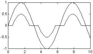 This plot shows the effect of the Dead Zone block on the sine wave. While the input (the sine wave) is between -0.5 and 0.5, the output is zero.