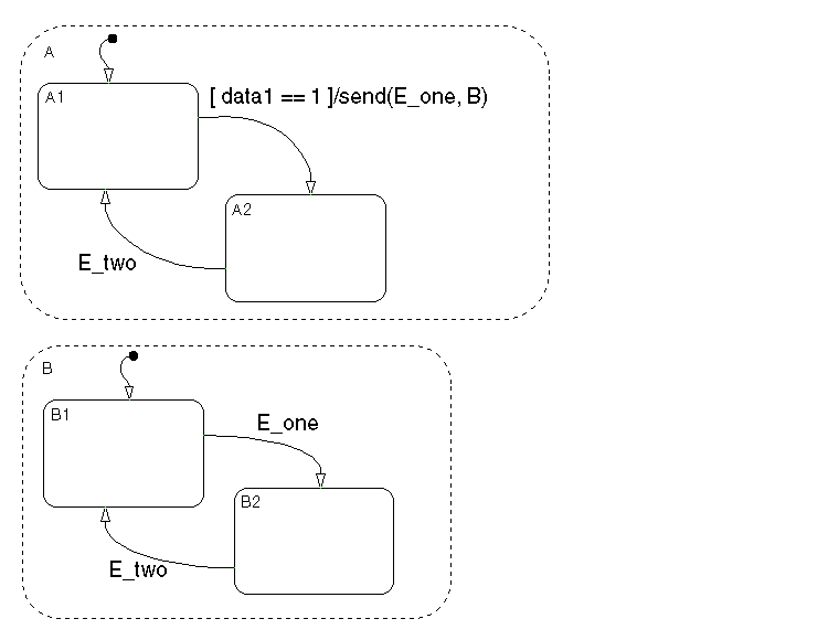 In this example, event E_one must be visible in both A and B. See Directed Event Broadcasting Using Qualified Event Names Example for information on the semantics of this notation.