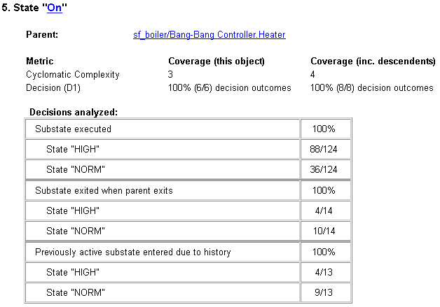 Cyclomatic complexity and decision coverage are also displayed for the On state including its descendants. This includes the coverage discussed above plus the decision required by the condition [warm()] for the transition from HIGH to NORM for a total of eight outcomes. Condition coverage and MCDC are both not applicable (NA) coverages for a state.