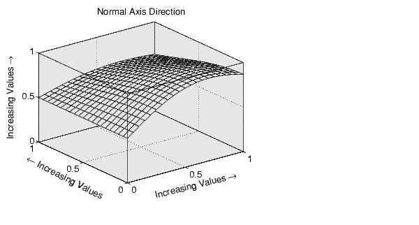The XDir, YDir, and ZDir properties control the direction of increasing values on the respective axis. In the default 2-D view, the x-axis values increase from left to right and the y-axis values increase from bottom to top. The z-axis points out of the screen.