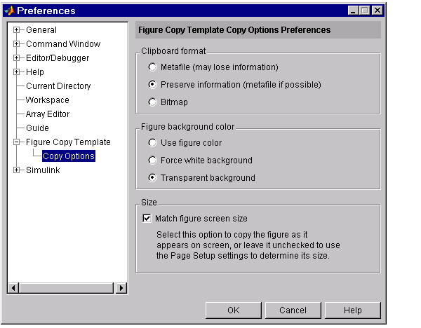 To invoke Copy Options Preferences select Copy Options from the Edit menu. This invokes the Preferences dialog box. In the left pane of this dialog box, select Figure Copy Template. Then select Copy Options, which invokes the Copy Options Preferences. They enable you to change session-to-session defaults specific to exporting using the Windows clipboard, including: whether the figure is copied as a bitmap or metafile, and how the background color is handled.