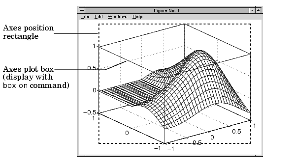 The axes Position property specifies the location and dimensions of the axes. The third and fourth elements of the Position vector (width and height) define a rectangle in which MATLAB draws the axes (indicated by the dotted line in the following pictures). MATLAB stretches the axes to fill this rectangle.