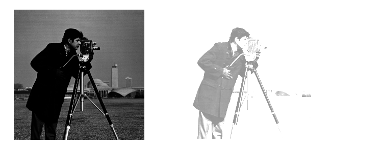 In addition to increasing or decreasing contrast, you can perform a wide variety of other image enhancements with imadjust. In the example below, the man's coat is too dark to reveal any detail. The call to imadjust maps the range [0,51] in the uint8 input image to [128,255] in the output image. This brightens the image considerably, and also widens the dynamic range of the dark portions of the original image, making it much easier to see the details in the coat. Note, however, that because all values above 51 in the original image get mapped to 255 (white) in the adjusted image, the adjusted image appears "washed out."