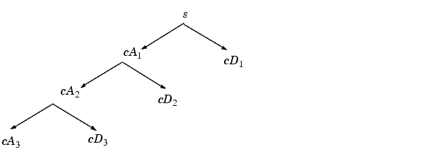 The next step splits the approximation coefficients cA1 in two parts using the same scheme, replacing s by cA1, and producing cA2 and cD2, and so on
