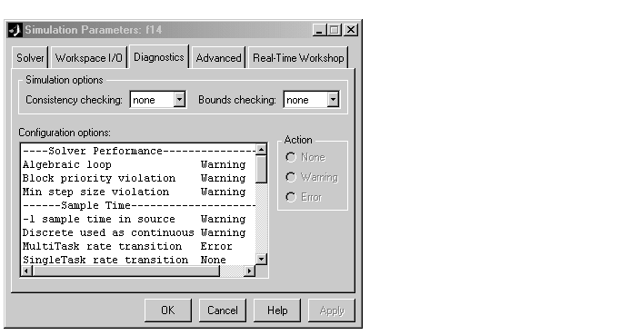 The Advanced pane of the Simulation Parameters dialog shown above also provides you with a control to specify whether model verification blocks such as Assert, Check Static Gap, and related range check blocks will be enabled, not enabled, or default to their local settings. This Model Verification block control popup menu has the same effect on code generated by Real-Time Workshop as it does on simulation behavior, and also may be customized.
