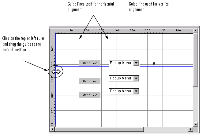 The Layout Editor has both vertical and horizontal snap-to guide lines. Components snap to the line when you move or resize them to within nine pixels of the line.