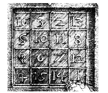 This image is filled with mathematical symbolism, and if you look carefully, you will see a matrix in the upper right corner. This matrix is known as a magic square and was believed by many in Dürer's time to have genuinely magical properties. It does turn out to have some fascinating characteristics worth exploring.