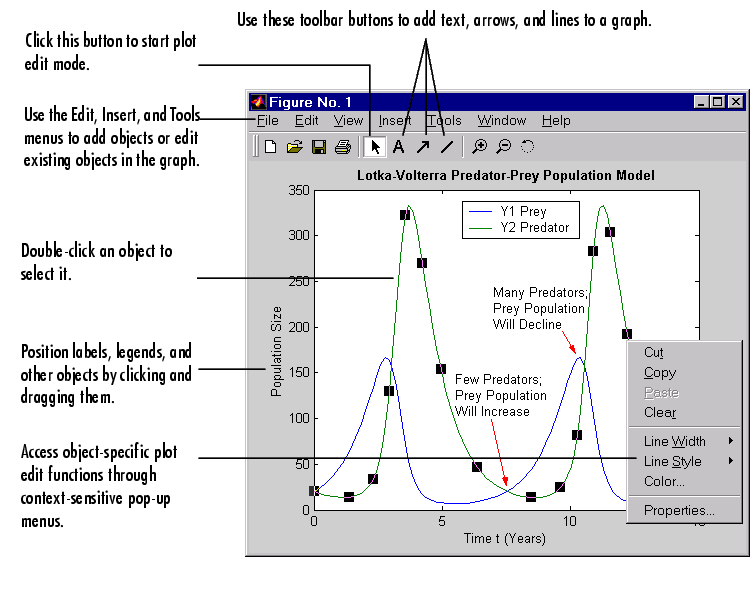 The MATLAB figure window supports a point-and-click style editing mode that you can use to customize the appearance of your graph. The following illustration shows a figure window with plot editing mode enabled and labels the main plot editing mode features.