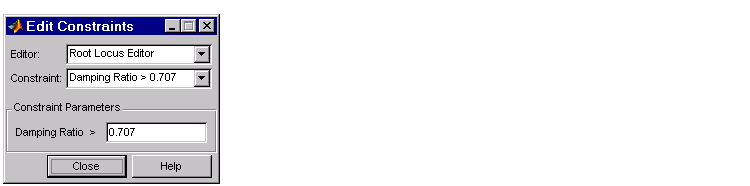 The SISO Design Tool provides design constraints that can make it easier to meet design specifications. If you want to place, for example, a pair of complex poles on your diagram at a particular damping ratio, select Design Constraints and then New from the right-click menu in the root locus. This opens the Design Constraints editor.