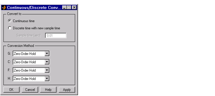 Discrete-time domain. If you currently have a discrete-time system, the Continuous/Discrete Conversion window looks like this figure.