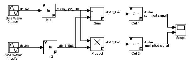 The data type display associated with the In 1 block in the model indicates that the output data type is sfix(16) (a signed, 16-bit, generalized fixed-point number) with [Slope Bias] scaling of [0.2 10]. Note that this scaling is not the block's default scaling. The data type display associated with the In 2 block indicates that the output data type is sfix(16) with radix point-only scaling of 2^-6.