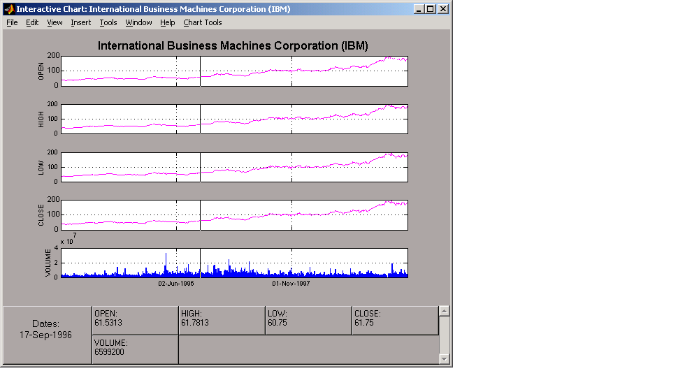You can find a tutorial on using chartfts in the section Visualizing Financial Time Series Objects. See Zoom Tool for details on performing the zoom. Also see Combine Axes Tool for information about combining axes for specified plots.
