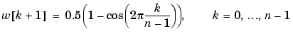 w = hann(n) returns an n-point symmetric Hann window in the column vector w. n must be a positive integer. The coefficients of a Hann window are computed from the following equation.
