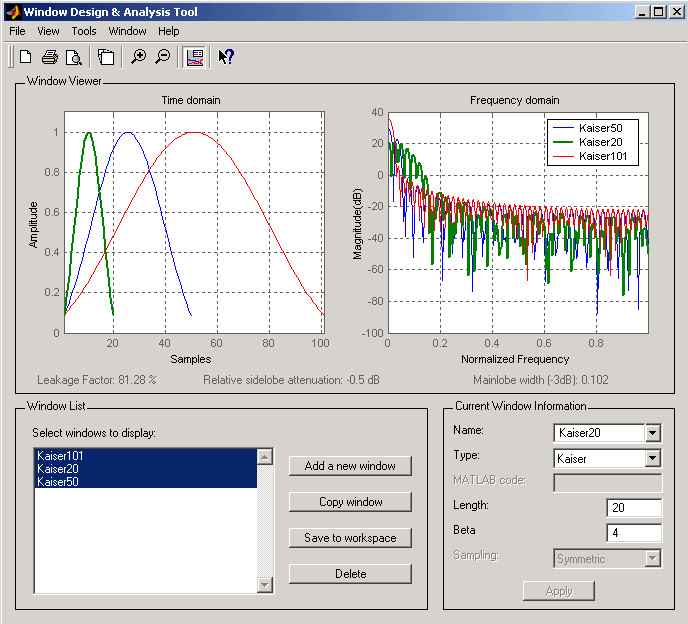 Examples of Kaiser windows with length 50 and beta parameters of 1, 4, and 9 are shown in this wintool example.