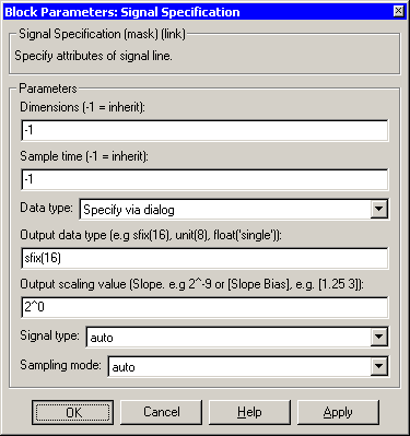 The Signal Specification block can be used as a mechanism to ensure that the attributes of a signal meet the desired attributes for certain sections of your model. For example, consider two people working on different parts of a model. The Signal Specification block is useful for indicating which attributes of various signals are needed by the different sections of the model. If there is a miscommunication and data types are changed unexpectedly, the attributes do not match and Simulink reports an appropriate error. Using the Signal Specification block helps ensure that you do not introduce unexpected problems into your models. If you are familiar with the assert mechanism in languages such as C, you can see that the Signal Specification block serves a similar purpose.