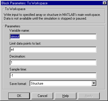 The To Workspace block writes its input to the workspace. The block writes its output to an array or structure that has the name specified by the block's Variable name parameter. The Save format parameter determines the output format.
