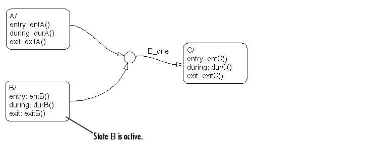 Initially the Stateflow diagram is asleep. State B is active. Event E_one occurs and awakens the Stateflow diagram. Event E_one is processed from the root of the Stateflow diagram down through the hierarchy of the Stateflow diagram: