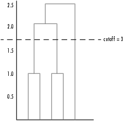 If you specify a cutoff value of 3, the cluster function cuts off the hierarchy at a lower point, bisecting three lines.