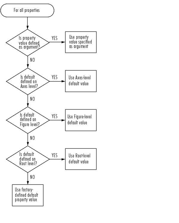 This diagram shows the steps MATLAB follows in determining the value of a graphics object property.
