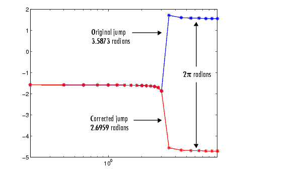 Using unwrap to correct the phase angle, the resulting jump is 2.6959, which is less than the default jump tolerance