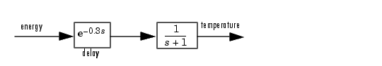 As an illustration, consider the following simple SISO model for a heating system with an input delay of 0.3 seconds, an input called "energy," and an output called "temperature."