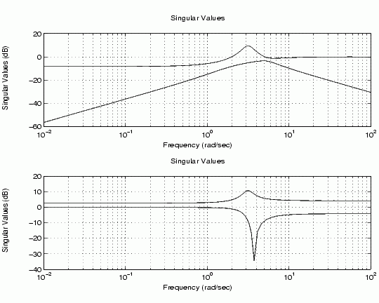 H = [0 tf([3 0],[1 1 10]) ; tf([1 1],[1 5]) tf(2,[1 6])] subplot(211) sigma(H) subplot(212) sigma(H,[],2)![]()