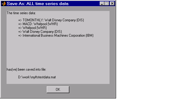This confirmation window indicates that the data has been saved in a new file named myftstestdata.mat.