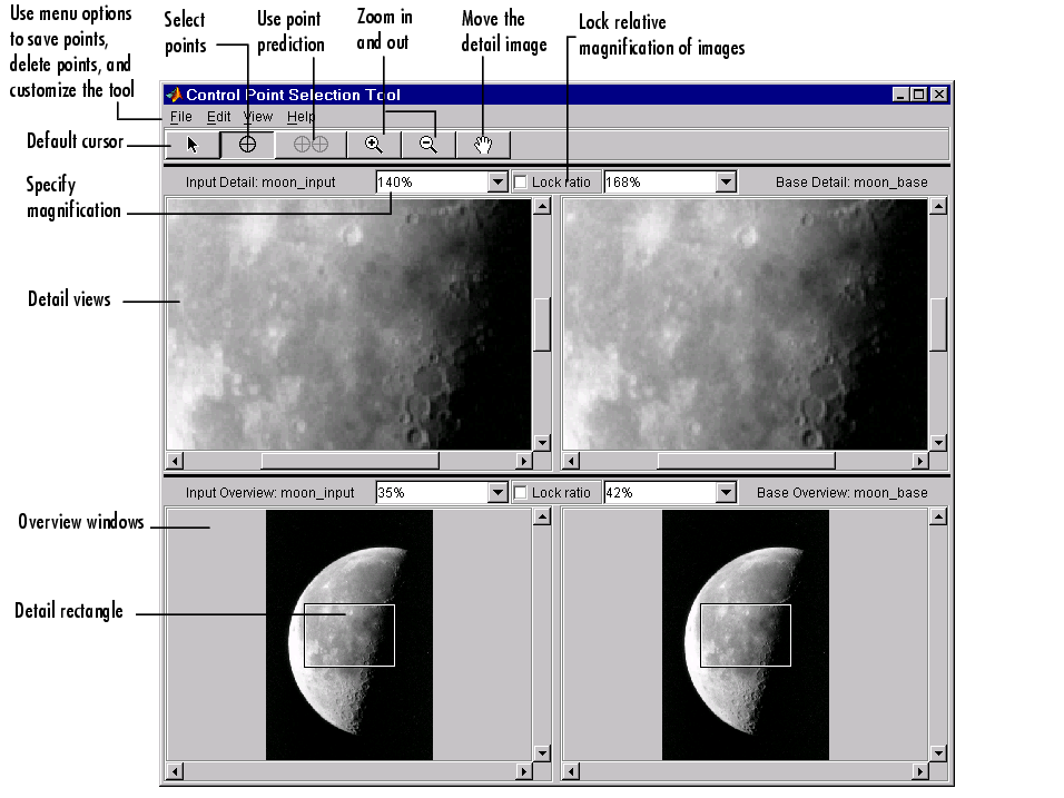 To specify control points in a pair of images you want to register, use the Control Point Selection Tool, cpselect. The tool displays the image you want to register, called the input image, next to the image you want to compare it to, called the base image or reference image.