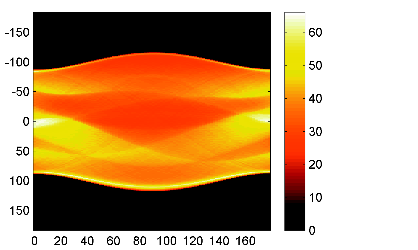 theta1 = 0:10:170; [R1,xp] = radon(P,theta1); theta2 = 0:5:175; [R2,xp] = radon(P,theta2); theta3 = 0:2:178; [R3,xp] = radon(P,theta3);